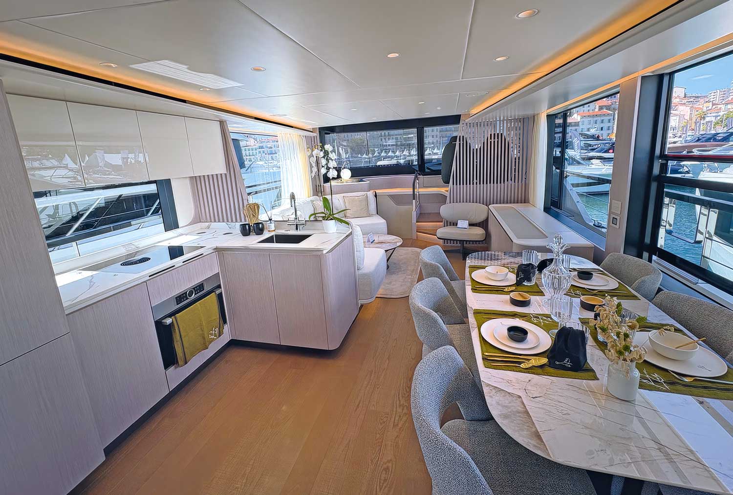 Alan genelinde, akıllı aydınlatma tasarımı, tek seviyeli güverte düzeni, geniş düşey camlar ve açılır borda tasarımı sayesinde kesintisiz bir akış hissi yaratılmış. Buna karşın, farklı yaşam bölümleri zarif lamelli ayırıcı panellerle birbirinden ince bir şekilde ayrılmış.