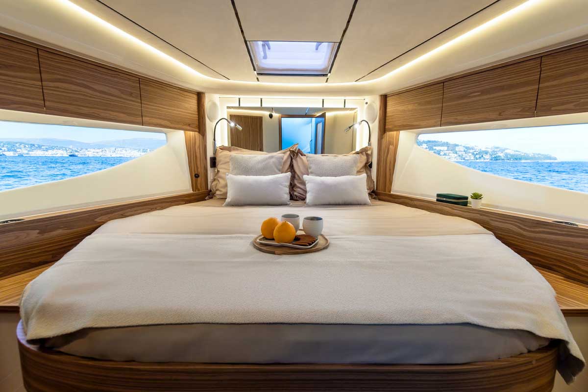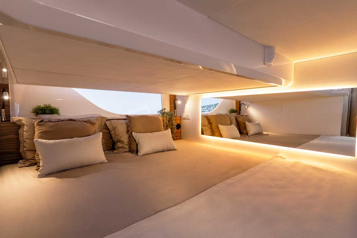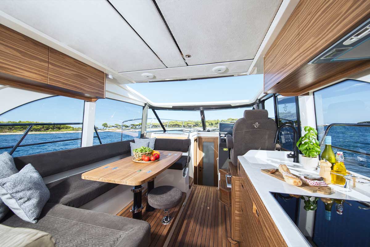 Kokpit alanı geniş, derin ve güvenli bir yerleşime sahip; etrafını saran U şeklinde oturma grubu sayesinde tüm yönlerden erişim kolaylığı sunuyor. Kıç aynada yer alan şık geçiş kapısı ise, aslında kare formundaki güvertede beşinci bir köşe oturma alanı yaratıyor. Büyük yemek masası ve ondan da büyük açılır tavan, oturma alanının keyfini üst düzeye çıkarıyor. Bekleneceği üzere, kıç kapılar tamamen açılabiliyor; ayrıca entegre tenteler havuzluk çevresinde döndürülerek kullanıldığında, kıçtan dümen mahalline kadar uzanan kesintisiz, korunaklı bir yaşam alanı yaratıyor.
