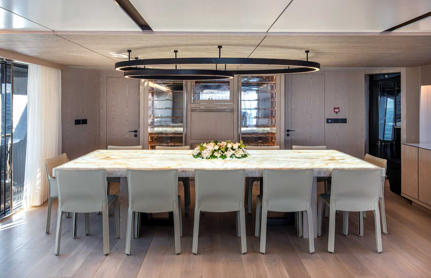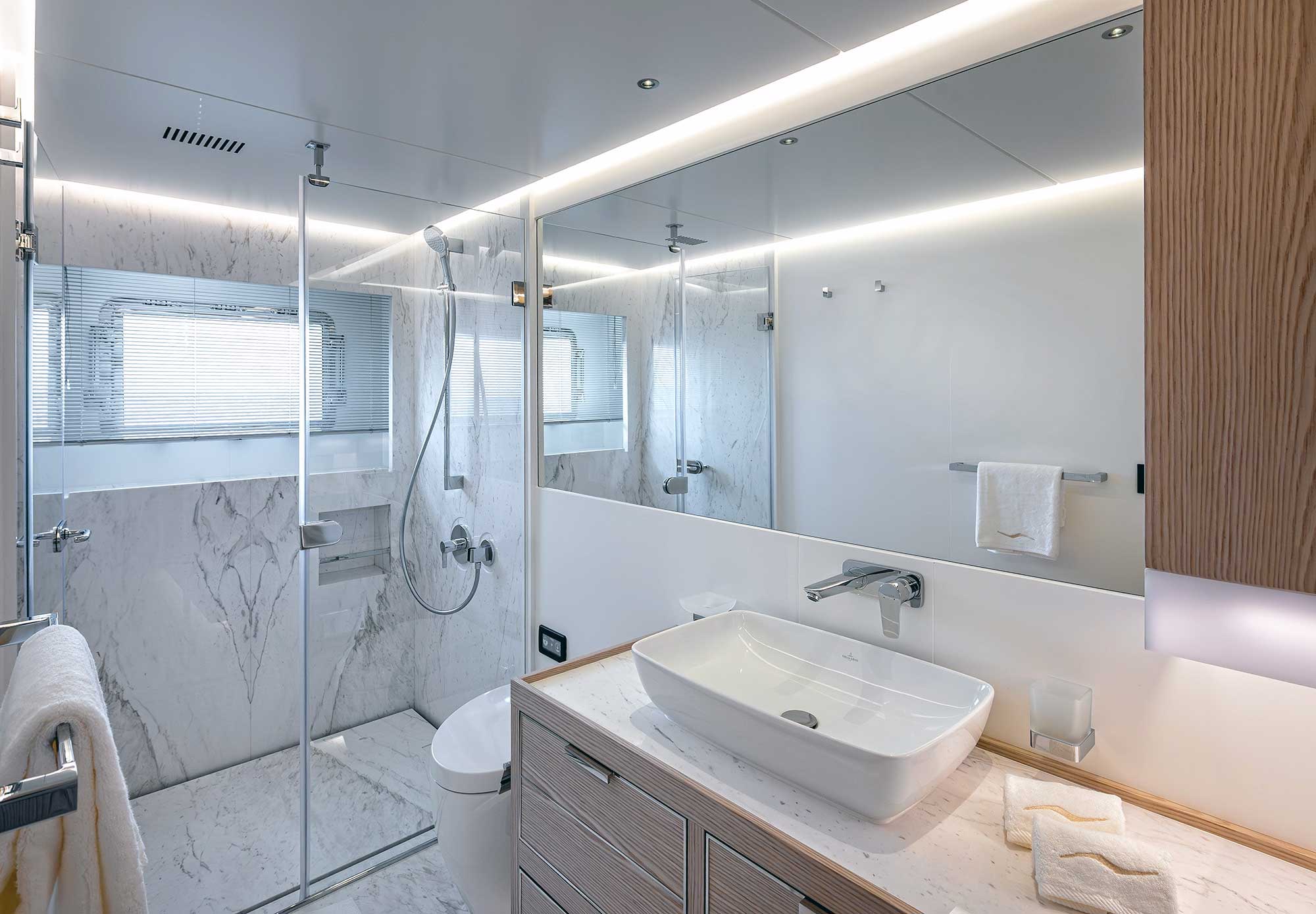Numarine 40MXP, iç mekânda da Numarine’in imza attığı genişlik hissini en üst seviyede sunuyor. Altı kamara konfigürasyonuyla 12 kişiye kadar misafir ağırlayabilen modelde, ana güvertedeki tam ene konumlandırılan master süit dikkat çekiyor. Büyük gövde pencereleri, doğal ışığı maksimum seviyede içeri taşıyor. Her Numarine 40MXP’nin iç tasarımı ise tamamen sahibinin zevkine göre kişiselleştiriliyor. İlk gövdede modern, aydınlık ve dingin bir atmosfer tercih edilmiş.